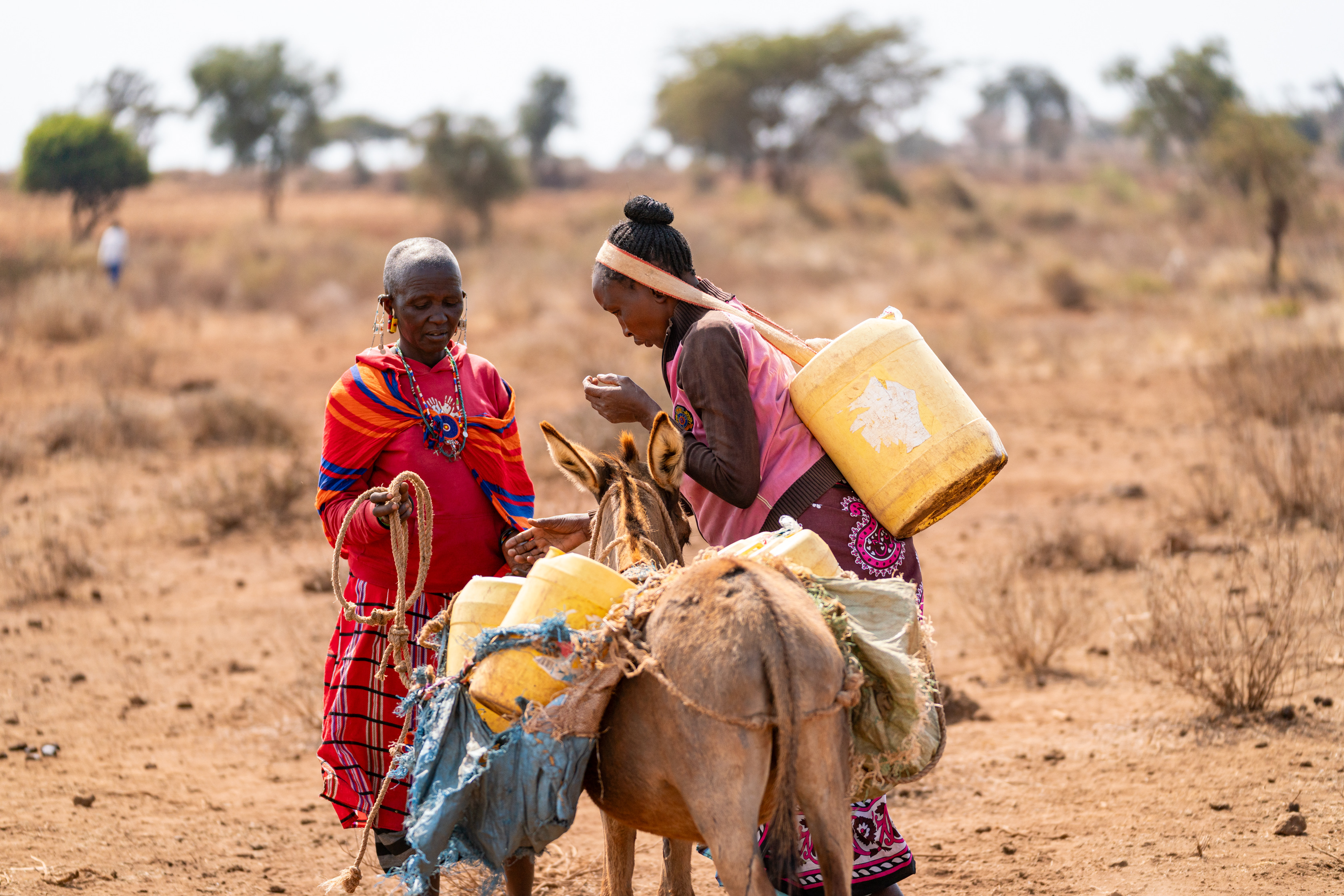 A mother and her daughter load water onto a donkey in southern Kenya near Inkisanjani, the site of a 2025 WILK clean water project.